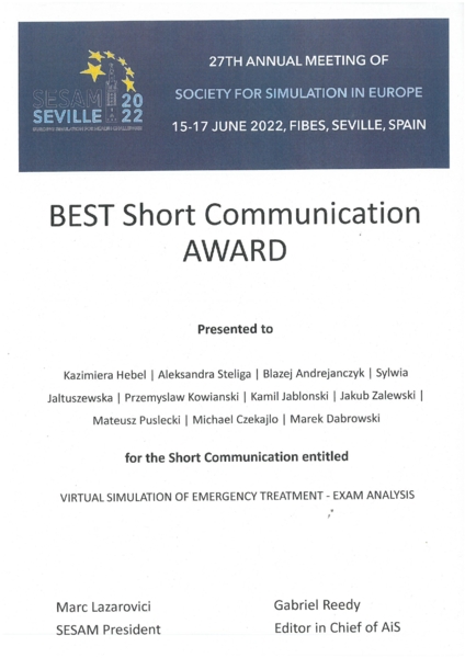 Na konferencji Stowarzyszeń Europejskich Centrów Symulacji Medycznej (SESAM) w dniach 15-17 czerwca 2022 r. w Sewilli (Hiszpania) Wykładowcy Katedry Pielęgniarstwa i Ratownictwa Medycznego zdobyli pierwsze miejsce w kategorii Best Short Communication spośród kilkudziesięciu wystąpień z całego świata.